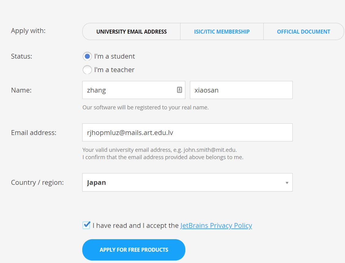 最近JetBrains系列IDE更新至2017.3.3后,本地代理idea.imsxm.com的方法也失效了,虽然可以多注册几个域名打持久站,但是用我的激活服务器的人太多了...一天后就会被封,临时看到JetBrains官网有免费的学生注册码,支持全部的IDE,自己也弄了一个,授人以鱼不如授人以渔,来吧,基佬们,我们开始了!